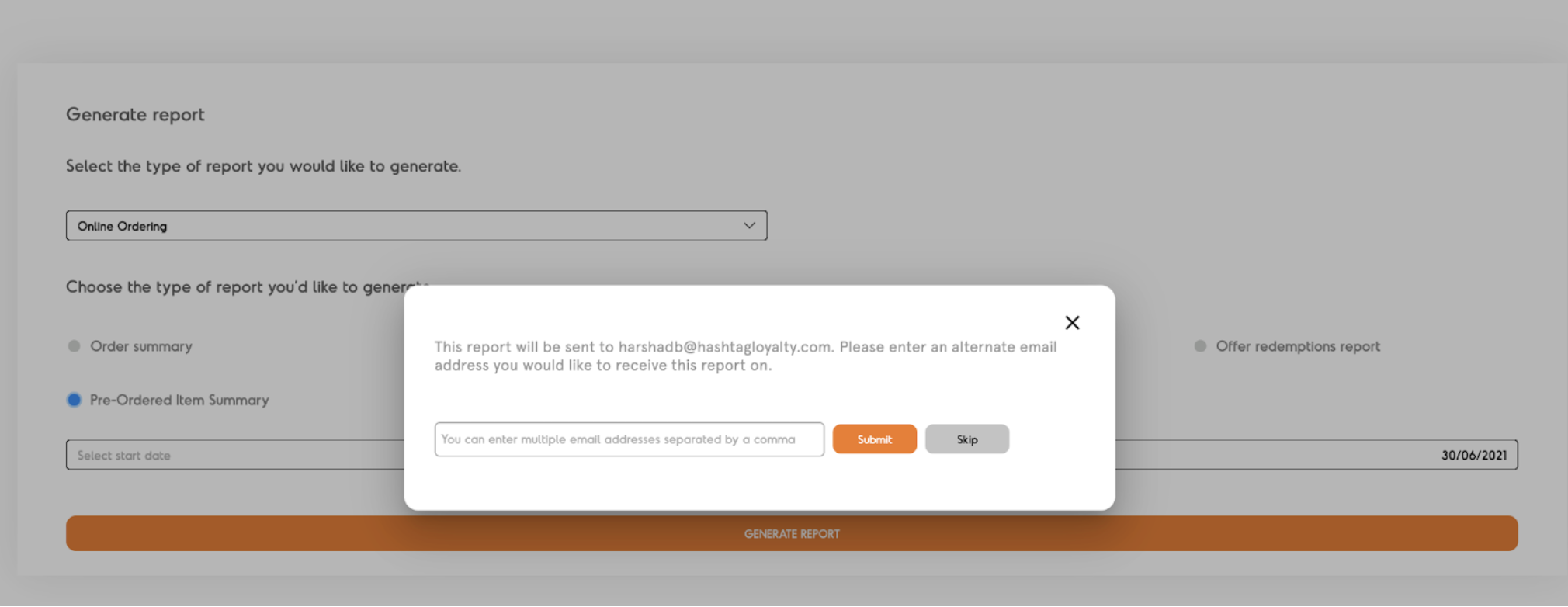 5.Click on Generate Report. The report will be sent to your registered email address by default, you can add alternative email addresses separated by a comma, to receive the reports on the same as well.